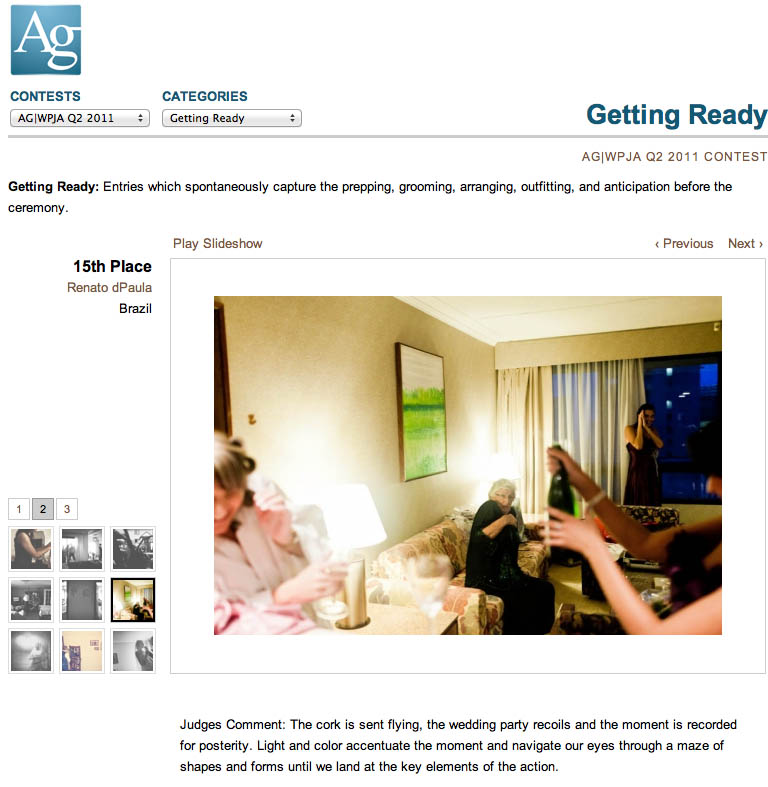 Saiu o resultado do segundo concurso internacional de fotografia artística de casamento da AGWPJA. Particularmente gosto muito dessa foto, o instante decisivo do estouro da champagne. A reação das madrinhas e principalmente da avó fazem essa foto transmitir o som do estouro.