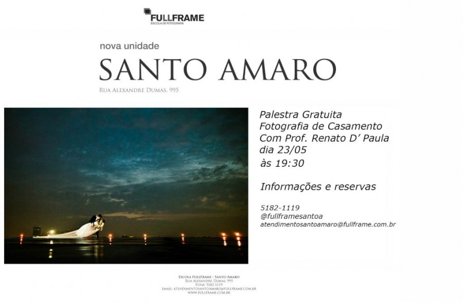 No dia 23/05, às 19:30h, na escola de fotografia Fullframe, unidade Santo Amaro, darei uma palestra gratuita sobre Fotografia de Casamento.